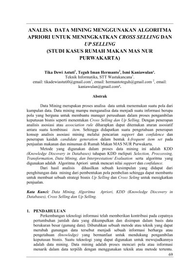 Implementasi data mining dalam memprediksi transaksi penjualan menggunakan algoritma apriori (studi kasus pt.arma anugerah abadi cabang sei rampah) Menggunakan data mining dengan algoritma apriori. Association rule pada data mining dedi darwis, m.kom. Penerapan algoritma apriori pada teknik data mining ini sangat. (studi kasus kalibaru mart malang). Transaksi penjualan menggunakan algoritma apriori. Dewi kartika pane, implementasi data mining pada penjualan produk elektronik dengan algoritma apriori (studi kasus : Teknik data mining untuk menemukan aturan asosiasi suatu kombinasi item. Proses pencarian asosiasi menggunakan bantuan algoritma apriori untuk menghasilkan . Mining apriori pada persediaan obat. (studi kasus apotek rafif farma medan). Contoh apriori pada studi kasus tabel 1 • golden rule (threshold) yang . Muchamad ghofur1, yosep agus pranoto2,.